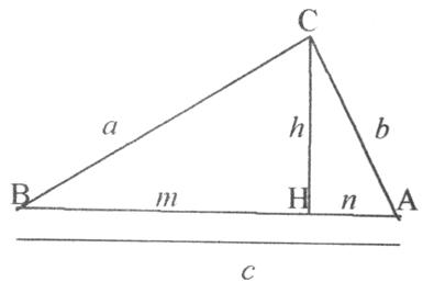 ABC, retto in Ĉ, si tracci l’altezza relativa all’ipotenusa e siano a, b, c, m, n, h, rispettivamente le